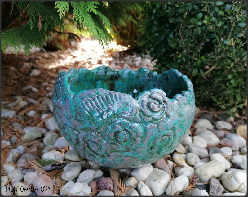 Tę miskę wykonałam w podobny sposób, jak komplet trzech ceramicznych misek z różyczkami. Również użyłam różyczek z gliny, wyciśniętych z silikonowej foremki dzień wcześniej, kuleczek utoczonych z gliny i płatów gliny z odciśniętym wzorkiem szydełkowej serwetki.